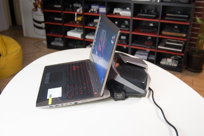 This is one of the reasons that the visuals on this computer became even more incredible – it is significantly slimmer than the other ROG or gaming laptops we have tested. When you add a full metal alloy casing and air vents at the back, the visual impression of the GX700 is stunning. However if you want to achieve the maximum performance levels you have to attach it to the aforementioned liquid cooling system, something completely new in the laptop world. The cooling system is actually a docking station, which in all fairness is not quite mobile, and it provides this laptop with the computing power others can only dream of. The system is very easy to use – you only need to put the laptop onto the dock and pull one lever which then injects it with the power conductors (the desktop graphics card requires much more power) and the coolant connectors. When you undock the laptop it reduces the clocks for the processor and the graphics card to the levels equivalent to the ones of the GTX 980M and resumes cooling the old fashioned way. The whole system is designed in such a way that there is absolutely no risk of any spills or leakages. What fascinated me the most is the fact that you can dock and undock the computer while it’s running. I must admit that is one of the sexiest engineering feats I have seen in a while!